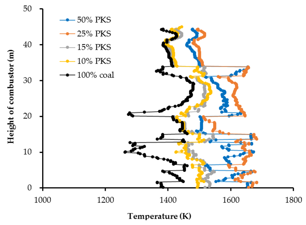 Figure 3 shows the temperature profile across the combustor for each corresponding PKS mass fraction. In general, higher PKS mass fractions produced higher flame temperatures inside the combustor as well as in the exhaust gases flowing to the superheater for energy recovery. The flame temperature became more uniform as the height in the combustor increased. Figure 4 shows the temperature distribution at the center of the combustor for each different PKS mass fraction. A higher PKS mass fraction resulted in a higher total volatile matter content during co-firing. The average temperature in the upper part of combustor, especially the freeboard, was lower than that of the lower part. This was probably a result of heat loss across the combustor.