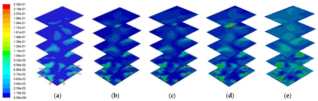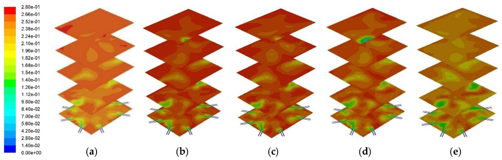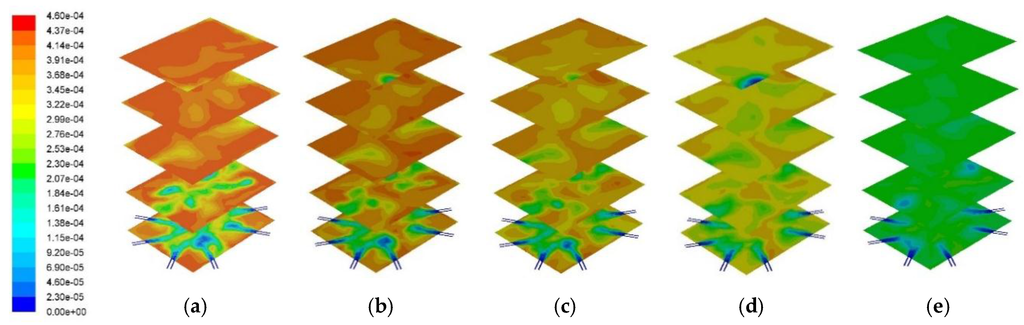 Cross-sectional O2 distribution profile across the combustor: (a) 0% PKS; (b) 10% PKS; (c) 15% PKS; (d) 25% PKS; and (e) 50% PKS.