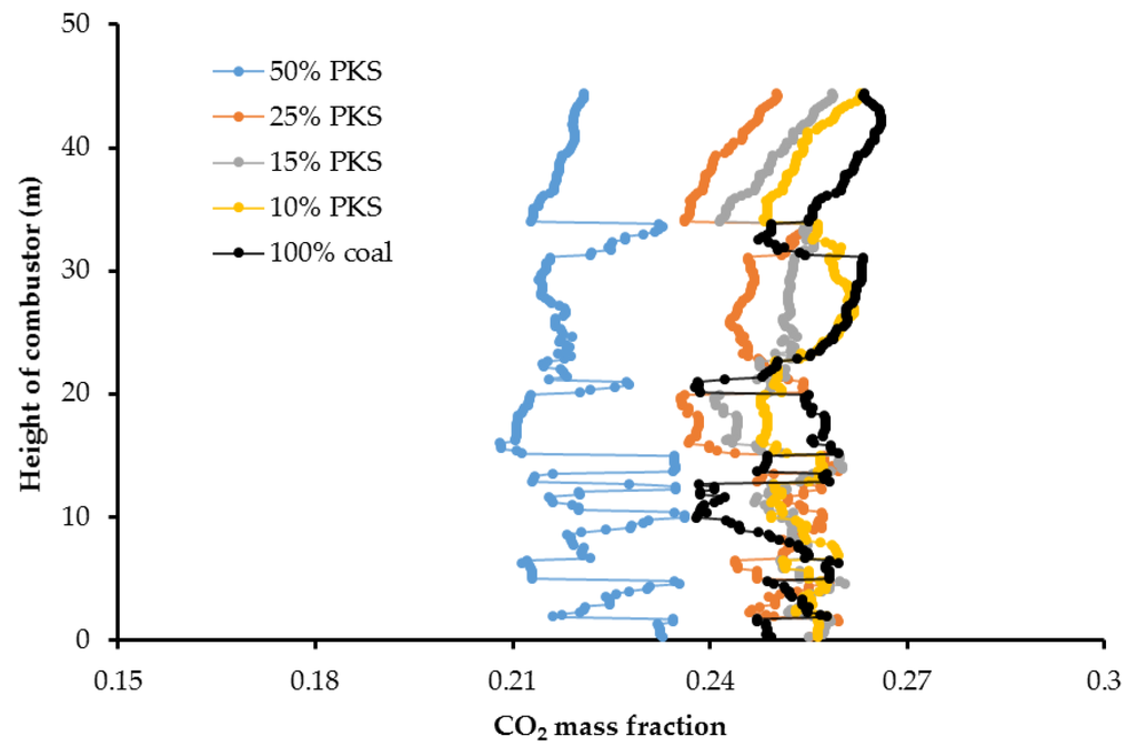 Figure 5 and Figure 6 represent the cross-sectional CO2 distribution profile and CO2 distribution at the center of the combustor. A higher PKS mass fraction resulted in a lower CO2 concentration in the exhaust gas. Numerically, the average CO2 mass fraction in the exhaust gas at the combustor outlet for PKS mass fractions of 0%, 10%, 15%, 25%, and 50% were 0.262, 0.256, 0.253, 0.246, and 0.220, respectively. In the reactions shown in (19–23), the carbon is mainly converted to CO2. As coal has a higher carbon content than PKS, the total amount of carbon decreased as the PKS mass fraction increased.