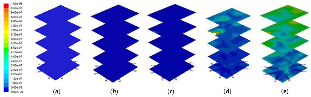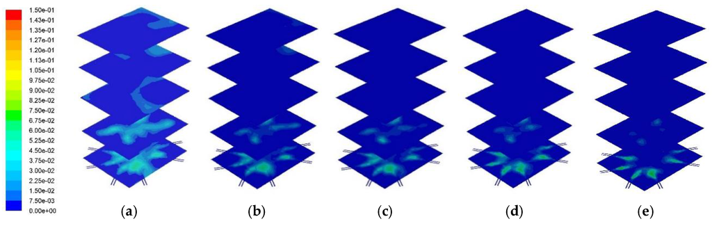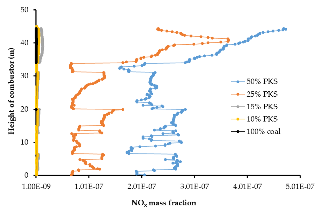 Figure 11 and Figure 12 represent the cross sectional NOx distribution profile and its distribution at the center of the combustor. A higher PKS mass fraction produced a higher NOx concentration. Numerically, the average NOx mass fractions at the combustor outlet for PKS mass fractions of 0%, 10%, 15%, 25%, and 50% were 1.2 × 10−9, 5.5 × 10−9, 1.2 × 10−8, 2.7 × 10−7, and 3.9 × 10−7, respectively. Although the PKS contained less nitrogen than coal (Table 1), NOx production increased in line with the PKS mass fraction, and was most pronounced at PKS mass fractions of 25% and 50%. It is known that there are three different primary sources of NOx from combustion: thermal, fuel, and prompt NOx. In this study, thermal NOx was considered to account for most of the exhausted NOx, and this was related to the PKS mass fraction.