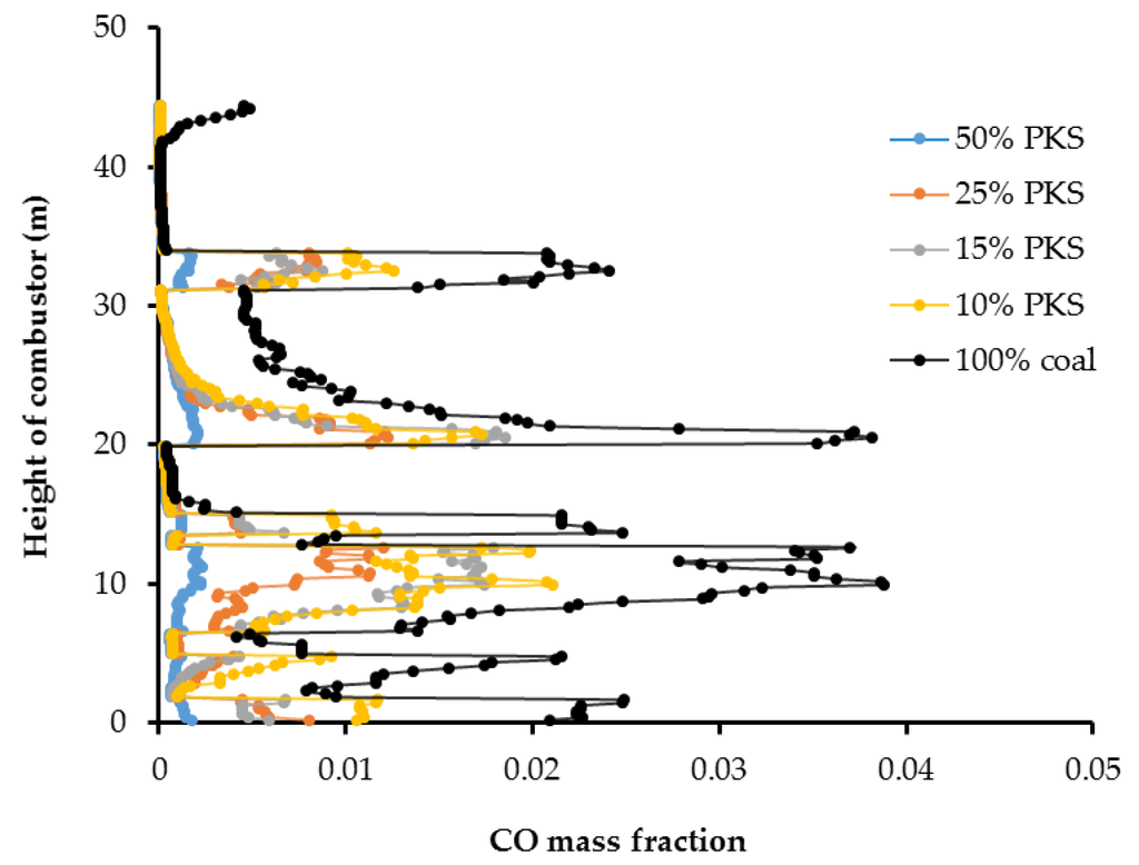Figure 7 and Figure 8 show the cross-sectional CO distribution profile and its distribution at the center of combustor, respectively. As the PKS mass fraction increased, the mass fraction of CO decreased. The average CO mass fractions at the combustor outlet for PKS mass fractions of 0%, 10%, 15%, 25%, and 50% were 0.0041, 0.0017, 0.0014, 0.0008, and 0.0002, respectively. When co-firing with PKS, almost no CO remained in the upper part of the combustor, suggesting that all the CO produced during devolatilization was burned during combustion. Coal has a higher carbon content than PKS and produces a higher mass fraction of CO during devolatilization. In coal firing without PKS, this CO remains in the flue gas, although at very small concentrations. This causes environmental problems. Co-firing with PKS therefore has the additional advantage of eliminating the CO from the exhaust gas.