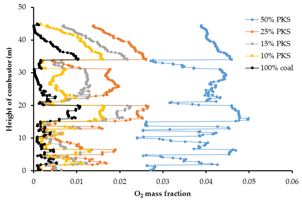 Large random temperature changes occurred at heights of less than 20 m, probably due to factors including the particle dynamics and random stages of combustion. The former is related both to the distribution of the feeding inlets, which ranged in height from 8 m to 16 m, and to the different physical properties of the coal and PKS particles. The latter is correlated with the different stages of combustion for different fuel particles. According to Williams et al. [32], combustion of coal and other solid fuels (including biomass) occurs in four stages: drying, devolatilization, char combustion, and ash formation. These stages of combustion are different for different fuels. This can be observed not only in the temperature distribution, but in other distributions discussed below.