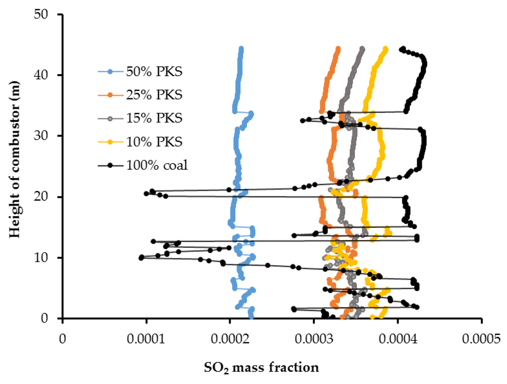 Figure 13 and Figure 14 show the cross sectional SO2 distribution profile and its distribution at the center of the combustor at different PKS mass fractions. A higher PKS mass fraction was associated with a significant reduction in the SO2 concentration. PKS has almost no sulfur content, in contrast with coal, so increasing the PKS mass fraction has the advantage of reducing the amount of SO2 in the exhaust gas.