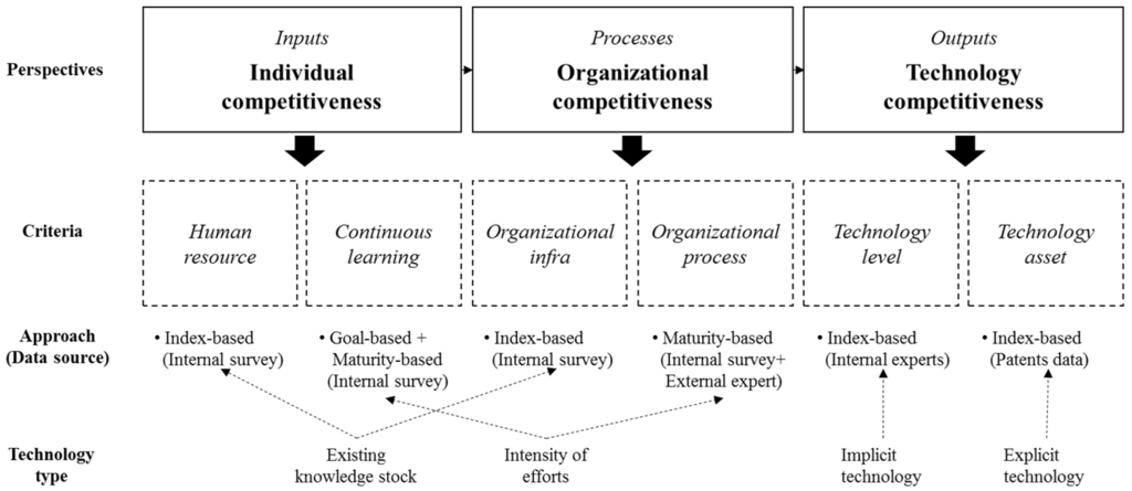 The basic idea is to determine how to insert inputs (individual capabilities) through any process (organizational capabilities), and to assess what outputs (technological results) are produced for the organization’s technological competencies. As a result, when individual competitiveness expands according to the internal environment of the organization and the system, the firm will develop technical excellence. Furthermore, in consideration of the quantity and flow of knowledge, the evaluation of each category of competitiveness is distinguished depending on the type of technological knowledge (explicit vs. implicit), and the kind of knowledge flow (embodied vs. disembodied).