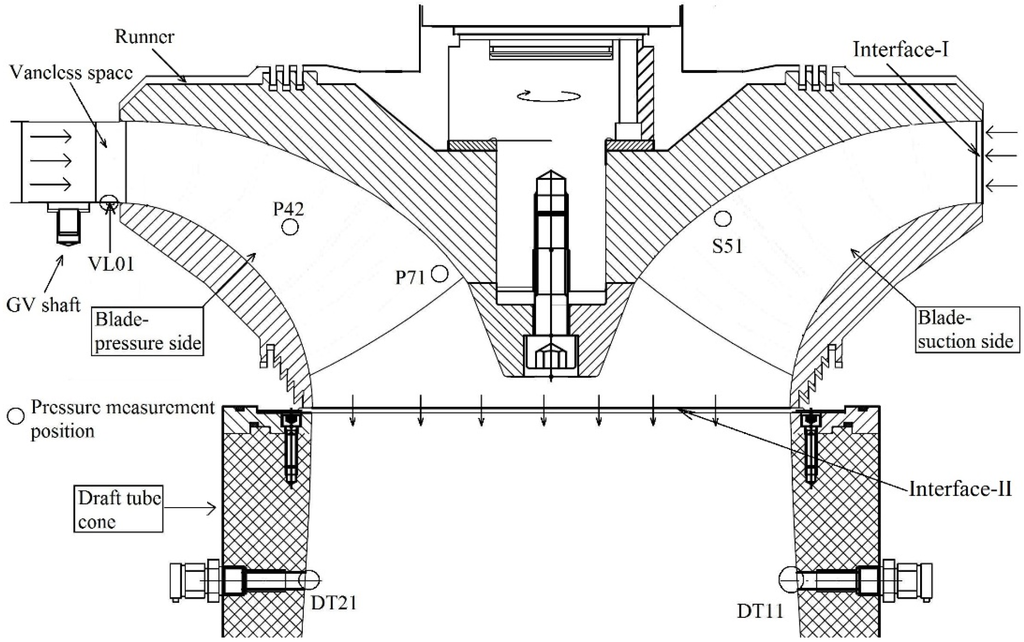 Figure 1). A sensor (vaneless space (VL01)) was integrated on the surface of the bottom ring in the vaneless space, a gap between the guide vanes row and the runner, to capture the effect of rotor stator interaction. Three miniature-type sensors, P42 (blade pressure side), P71 and S51 (blade suction side), were integrated on the runner blade surfaces at the pressure side, the trailing edge and the suction side, respectively. Data from the runner sensors were acquired using a wireless telemetry system, Summation Research SRI-500e. The remaining two sensors, DT11 (draft tube cone) and DT21, were mounted to the wall of the draft tube cone. Both sensors were located 180° radially apart from each other at the same axial position (