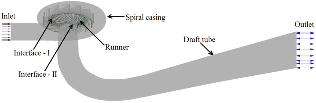 NQE = 0.27) was used in the experimental studies. The turbine included 14 stay vanes that were integrated into the spiral casing, 28 guide vanes, a runner with 15 blades and 15 splitters and an elbow-type draft tube. The reference diameter (