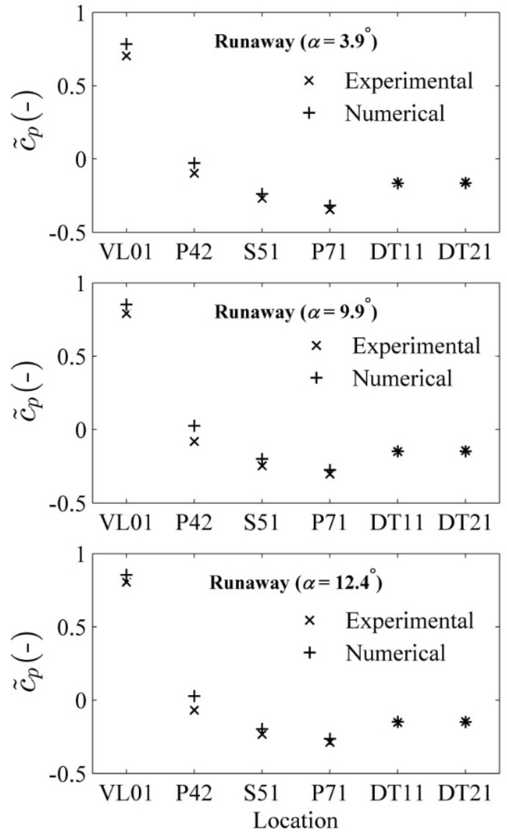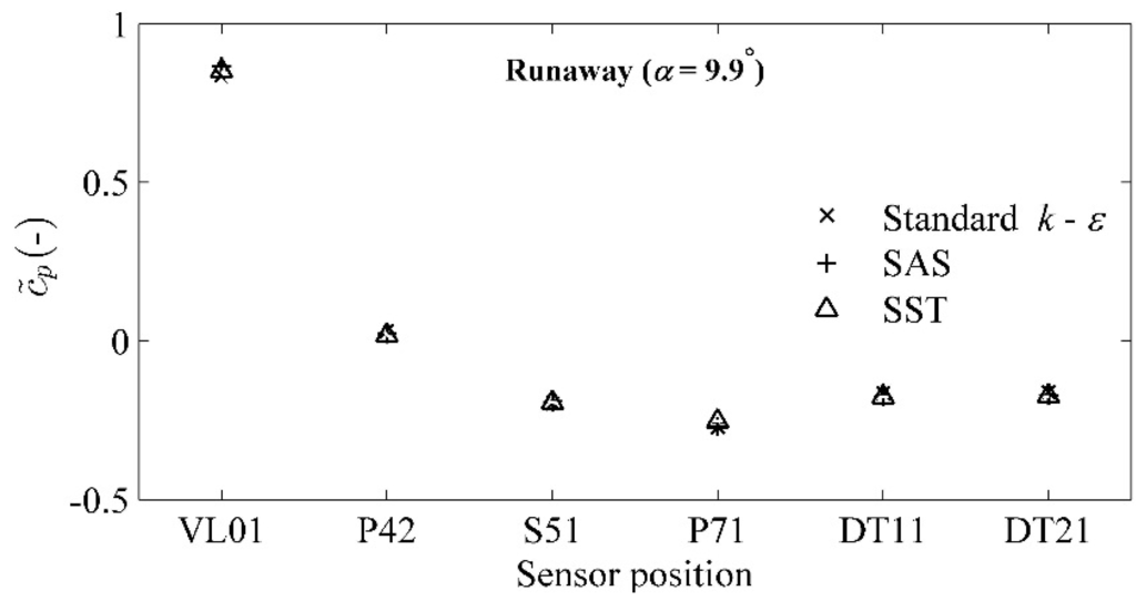 QR) was lower at the runaway conditions than at the BEP, as expected. At the constant angular position of 9.9°, the discharge values at the runaway and BEP conditions were 0.08 and 0.2 m