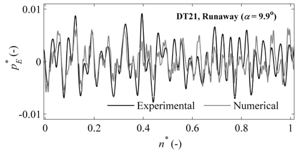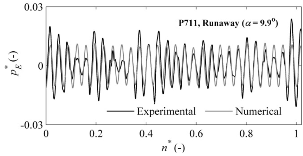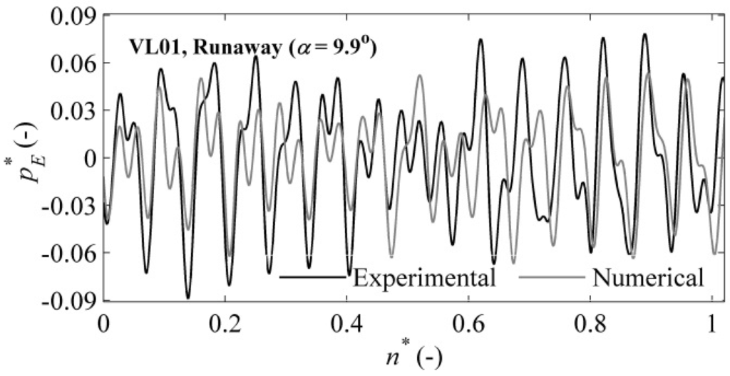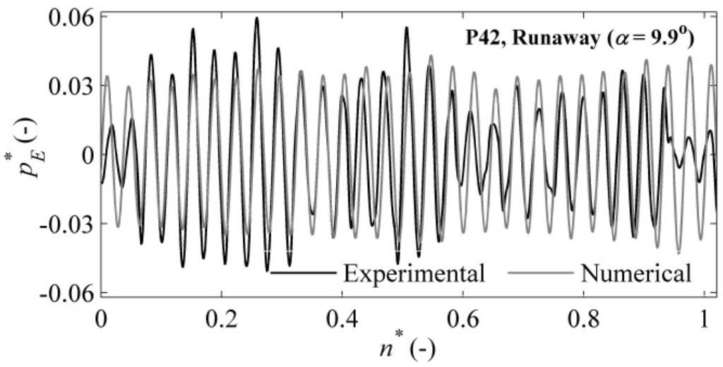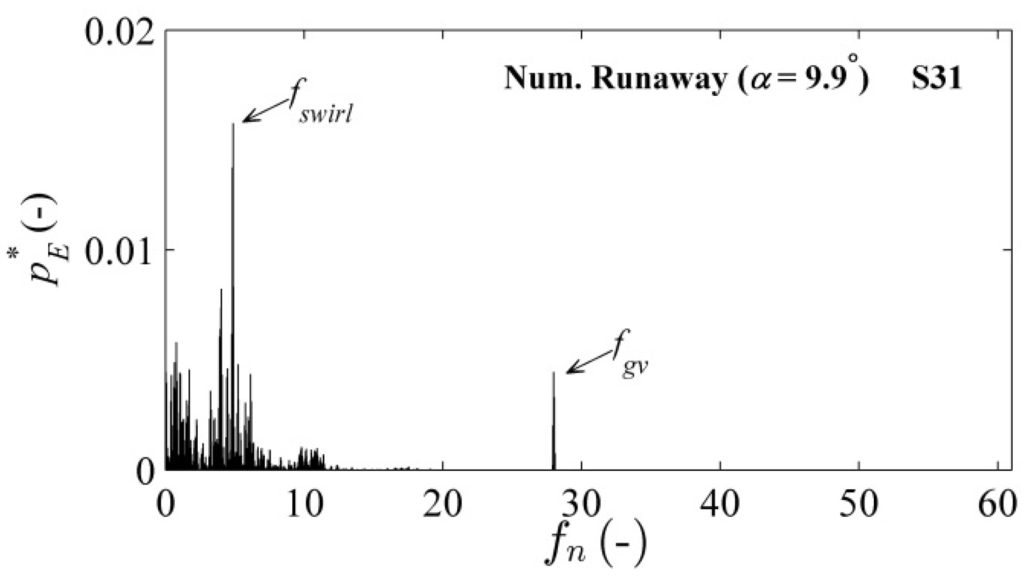 Similar differences between the experimental and numerical dimensionless pressure coefficients were obtained at the investigated points of the runaway condition. A maximum difference of 12.8% between the experimental and numerical results was observed in the runner. This result could be attributed to the under-prediction of the losses from flow separation in the runner. The deviation may be attributed to the variation in capturing the flow unsteadiness (a rotating stall-type condition) due to the large grid size at some locations of the turbine. However, the difference between the experimental and numerical values was within the band of numerical uncertainties that was estimated in the mesh performance analysis. In the draft tube, a moderate pressure difference of 2.1% was observed. Moderate differences between the time-averaged experimental and numerical pressure values were found for the vaneless space and the runner. A PSD analysis of the time-averaged pressure signal for the vaneless space yielded an extremely high amplitude at the runaway condition, which was 2.8-times the amplitude observed at the BEP.