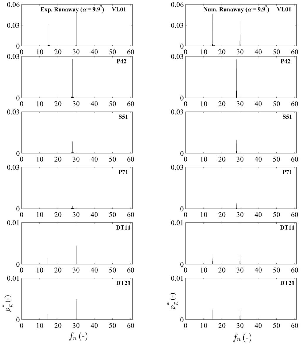 Figure 13 shows the PSD analysis of the pressure-time signals that were obtained for the runaway operating condition at an angular position of the guide vanes of 9.9°. The experimental and numerical frequency spectra at the pressure measurement at locations VL01, P42, S51, P71, DT11 and DT21 are compared in the figure. The pressure-time data of the measurement were processed through a designed filter in MATLAB to enhance the visualization of the investigated frequencies and the corresponding amplitudes. The frequencies that were not related to the flow were filtered out,