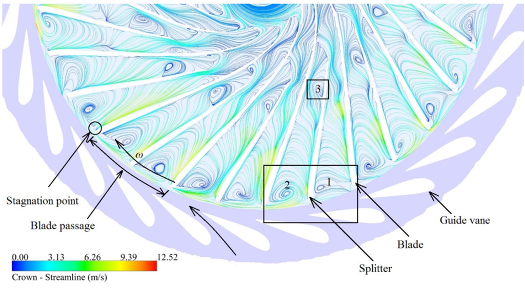 t = 1.14 s) at the runaway operating condition (α = 9.9°). Three regions with a vortical flow can be observed. Two regions were at the inlet of the blade passage and are marked as “1” and “2”; a third region marked as “3” was located between the splitter suction side and the blade pressure side, near the splitter trailing edge. The rotating direction of the vortical flow in Regions 1 and 2 was opposite the direction of the runner rotation, whereas the direction of the vortical flow in Region 3 was the same as the runner rotation. Similar vortical regions were observed for all of the blade passages of the runner.