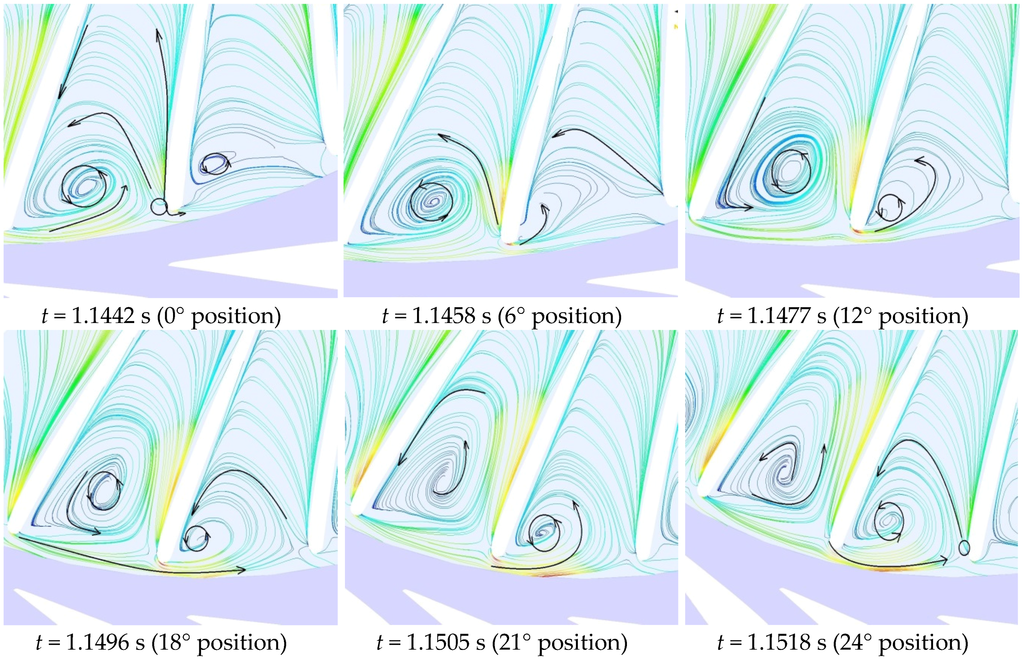 t = 1.1442 s): (i) a portion of the flow accelerated toward the blade channel; (ii) a portion of the flow traveled toward Vortical Region 2; and (iii) a portion of the flow traveled toward the vaneless space in the direction of the runner rotation. At an angular position of 12°, Region 1 evolved further, and the flow rotated about a local axis in the counter clockwise direction. At an angular position of 24°, Region 1 became larger. Thus, the vortical flow developed with time up to an angular position of 74°. The cycle was observed and repeated for each angular movement of 74° of the runner. A similar phenomenon was observed for Vortical Region 2.