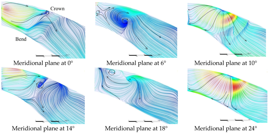 i.e., the middle of the blade channel, the development of a large vortical region that rotated in the clockwise direction was clearly observed. The flow at the crown side accelerated more than at the band side, which may have created a large pressure difference in the channel, causing the flow to recirculate. The entire vortical flow region was pushed to the down side of the passage by the angular motion of the runner. At the meridional plane at 10°,