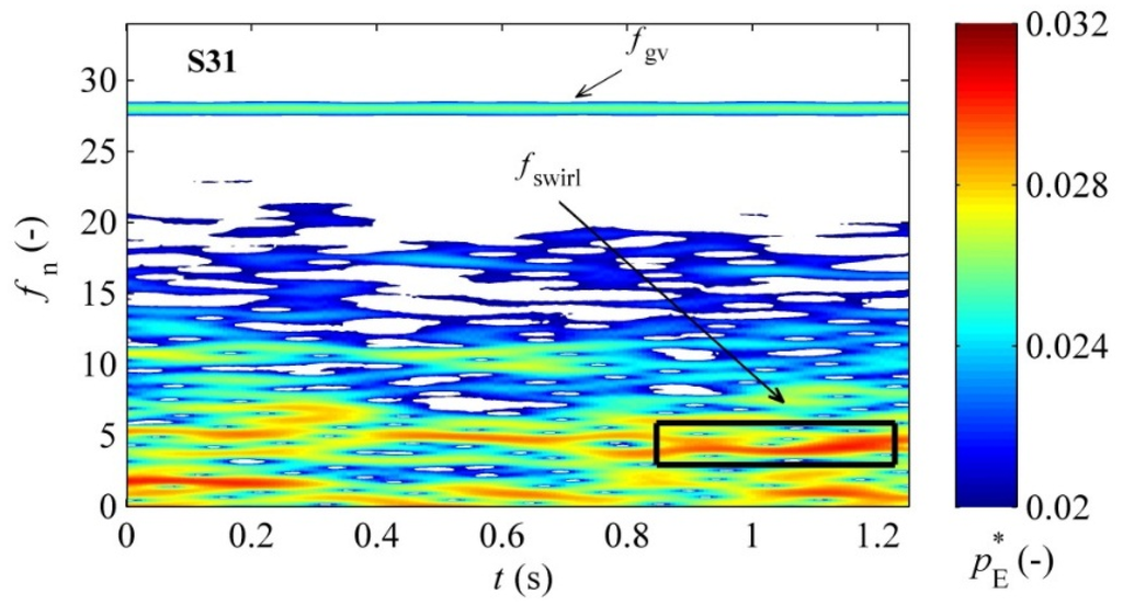 fswirl was 0.015, which corresponded to an absolute value of 1.8 kPa. The dimensionless frequency of 4.8 corresponded to the angular movement of the runner of 74.5°, which matched the angle of the maximum vorticity, as was discussed for the angular movement of the blade passage.