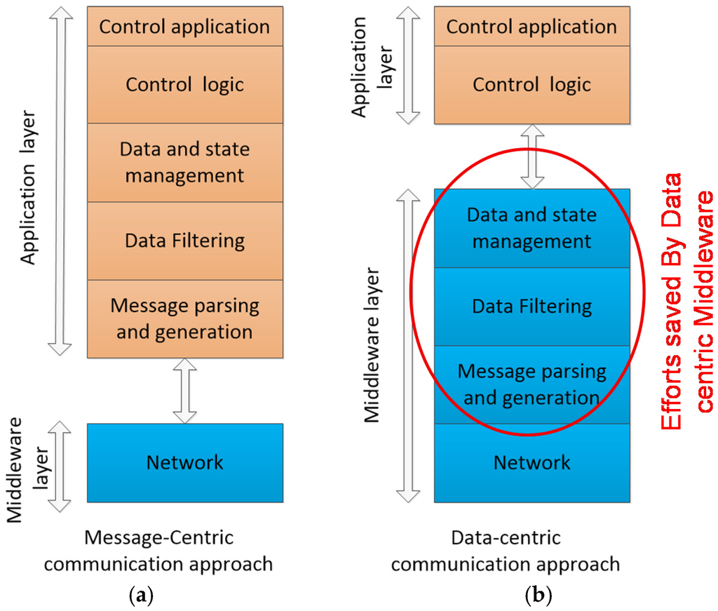 Middleware approaches: (a) message-centric; and (b) data-centric as described in [18].