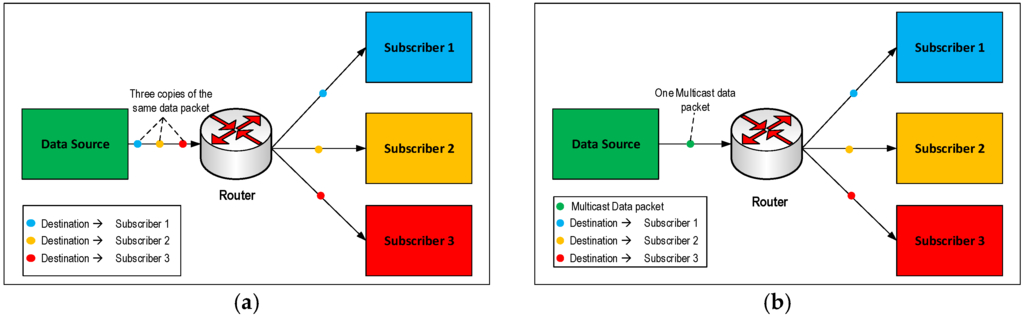 In the unicast communication, the publisher sends a copy of the data for each subscriber node as shown in Figure 6a. For example, EMS and demand-side management systems can subscribe to receive the price and consumption data published by a smart meter. In this case, two copies of the same data will be sent over the network [11]. If a smart appliance subscribes to the same data, a third copy will be sent to the new subscriber. The bandwidth used to send the data will increase linearly as the number of the nodes subscribing to the data increases. This method of communication could be suitable for local high-speed networks and it is simple to configure, but is not the ideal method when considering transmitting data over the wide area network (WAN) or a low speed communication line in the case of wide area measurements and Phasor measurement unit (PMU) data. For the data requested by multiple readers, it is better to use a multicast communication scheme. In the multicast, the publisher sends only one copy of the data for the remote subscriber as shown in Figure 6b. The bandwidth is independent on the number of subscriber nodes. Only one copy will be sent over the WAN communication line. At the receiving end, the router will forward a copy of the data to each subscriber. In order to use the multicast communication scheme for certain data, a multicast QoS policy has to be applied to this data.