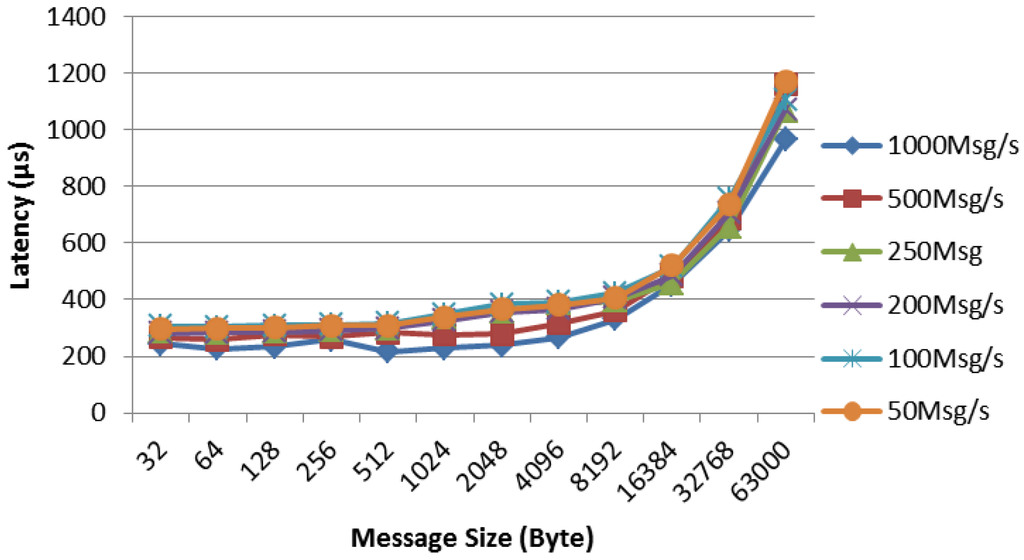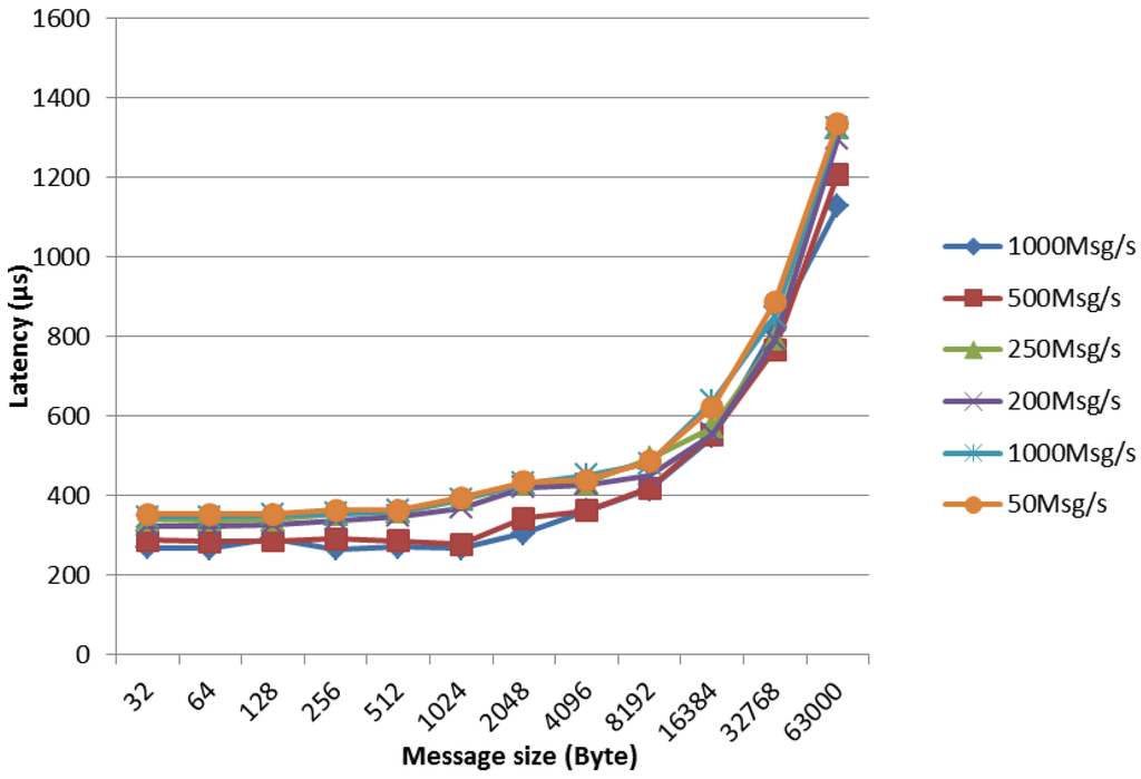 Real-time control and monitoring requires predictive behavior from the communication network. The communication latency and maximum throughput should be known for different scenarios. The message size and data rates are dependent on the application and the data type. Measurements and control commands usually use a small message size whereas data logging may use a longer message size. Other applications, such as database replications and data backups, will use a long message size. A performance test for the communication network and DDS middleware were performed to benchmark the network performance and find out the latency corresponding to different message rates and sizes. The performance test was executed by transmitting 10,000 messages and measuring the latency for each message. The test is repeated with unicast and multicast configurations. By knowing the data rate and message size required by the specific application, the users can find out the latency budget and make sure it does not violate the application requirement. Figure 7 shows the performance results for the network with unicast communication and the best effort QoS profile. The horizontal axis represents the message size in bytes while the vertical axis represents the latency in microseconds. The test was repeated for different message rate starting from 50 Msg/s to 1000 Msg/s.