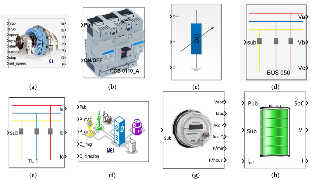 Developed Matlab Simulink blocks (a) generator; (b) circuit breaker (CB); (c) load; (d) busbar; (e) transmission line; (f) microgrid; (g) smart meter; and (h) energy storage.