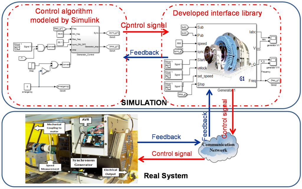 The implementation of the HIL is depicted in Figure 10. It can be seen that the control algorithm is simulated in the Matlab/Simulink environment. The control command is transmitted to the real hardware using the developed interface toolbox over the network using the DDS middleware and specified QoS. Real-time feedback from the physical measurement points are transmitted back to the Simulink model. The generator block in the HIL model replaces the regular Simulink simulation model for a synchronous machine with the actual machine. This capability makes it possible to consider the real behavior and dynamics of the physical system in the control design. In addition, the HIL model represents the system as an integrated CPS by taking into account the effect of the communication network behavior. The impact of different communication topologies and QoS profiles on the performance of the system can be investigated.