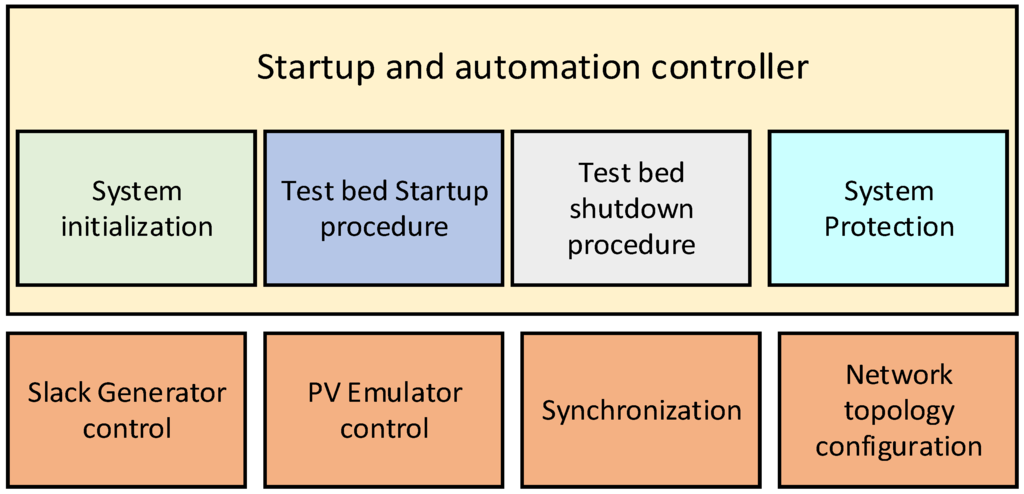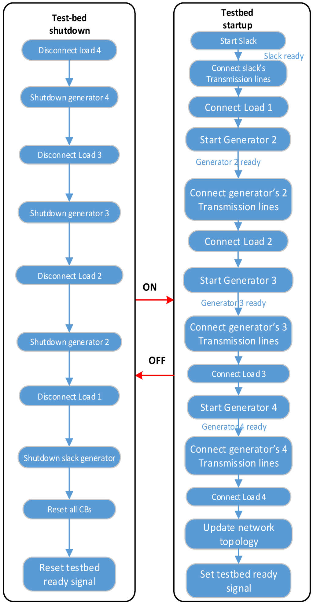 The high level controller is responsible for coordinating the operation of the low level generator startup controllers and configuring the testbed network topology by connecting necessary transmission lines, busbars, and loads. As shown in Figure 15, the main controller consists of two main states: namely, startup and shutdown. In the startup state, the controller calls the generator start up algorithms in the required order and monitors the generator status. Then, it connects the CBs to configure the testbed topology and connect the loads. Once all the generators are running and the topology configuration is done, it generates a ready signal for the entire testbed. This signal can be used to enable starting up a certain experimentation procedure. In the shutdown state, the controller shuts down the generators in the correct order by shutting down the power controlled generators one-by-one while disconnecting any connected loads to avoid overloading the remaining generators. Finally, after shutting down all the power controlled generators, the slack generator is disconnected and all circuit statuses are reset to an open state.