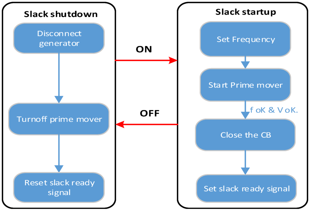 To simplify the initialization and startup of the testbed, an automated startup and initialization procedure was developed using a state machine. These startup and automation controllers abstract the procedure of initializing the testbed physical components by performing all the necessary steps to run the testbed. The startup controllers setup the system frequency, startup and synchronize the generators, configure the network topology, and connect different loads. The shutdown procedure ensures a correct shutdown sequence to prevent component damage. The user can utilize this controller as it is or use it as a base template to build his own controller. The hierarchy of the automatic controller is shown in Figure 11 where it can be seen that the control is divided into two levels. The low level consists mainly of three state machine controllers. The block diagram for the first controller is shown in Figure 12 which is responsible for starting up and shutting down the slack generator. In the startup state, the controller sets the speed of the generator at the required value depending on the required operating frequency. Then, it changes the status of the generator to the “on” state. When the output voltage and frequency reach the nominal values, the controller generates a ready signal to indicate that the slack generator is ready. While in a slack shutdown state, the controller sends a turn off signal to the generator and resets the generator ready signal to zero.