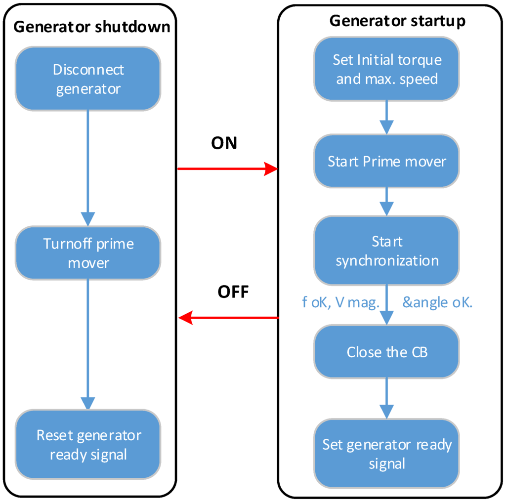 The state machine for the second controller shown in Figure 13 is responsible for startup/shutting down of the power controlled generators in the system. In the startup state, the first step is to send a start signal to the generator then start the synchronization process shown in Figure 14. After the synchronization process has completed, the controller closes the generator CB to connect the generator to the testbed. After that, it generates a ready signal to indicate the successful completeness of the starting up process. In the shutting down state, the controller opens the generator CB and sends a shutdown signal to the generator.