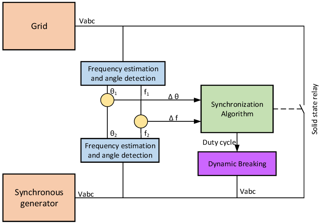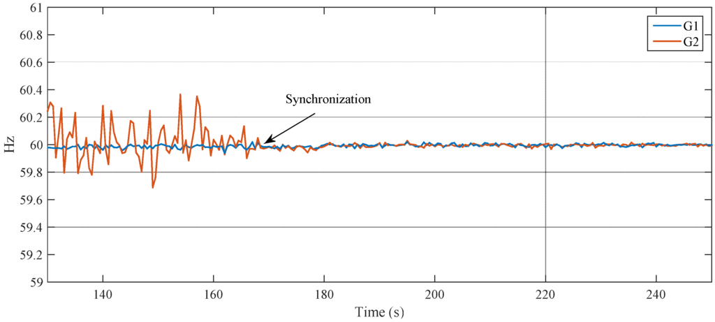 In this experiment, the capability of implementing a closed-loop high speed controller using the proposed framework is shown. The synchronization process requires a high sampling rate for frequency and phase angle estimation and low latency feedback. The sequence of automatic system operation starts by starting generator 1 (slack) as shown in Figure 11. During this step, a starting signal is sent to the prime mover along with the frequency reference value. The generators’ prime movers are controlled using the RS-485 protocol. The protocol translator, shown in Figure 4, is used to provide interoperability between the DDS network and serial protocols. When the slack generator frequency reaches 60 Hz, the automation controller connects transmission lines TL 1-2 and TL 1-8, and then connects load 1. In this scenario, load 1 is set at 600 W. Then, generator 2 is started and synchronized to the slack generator.