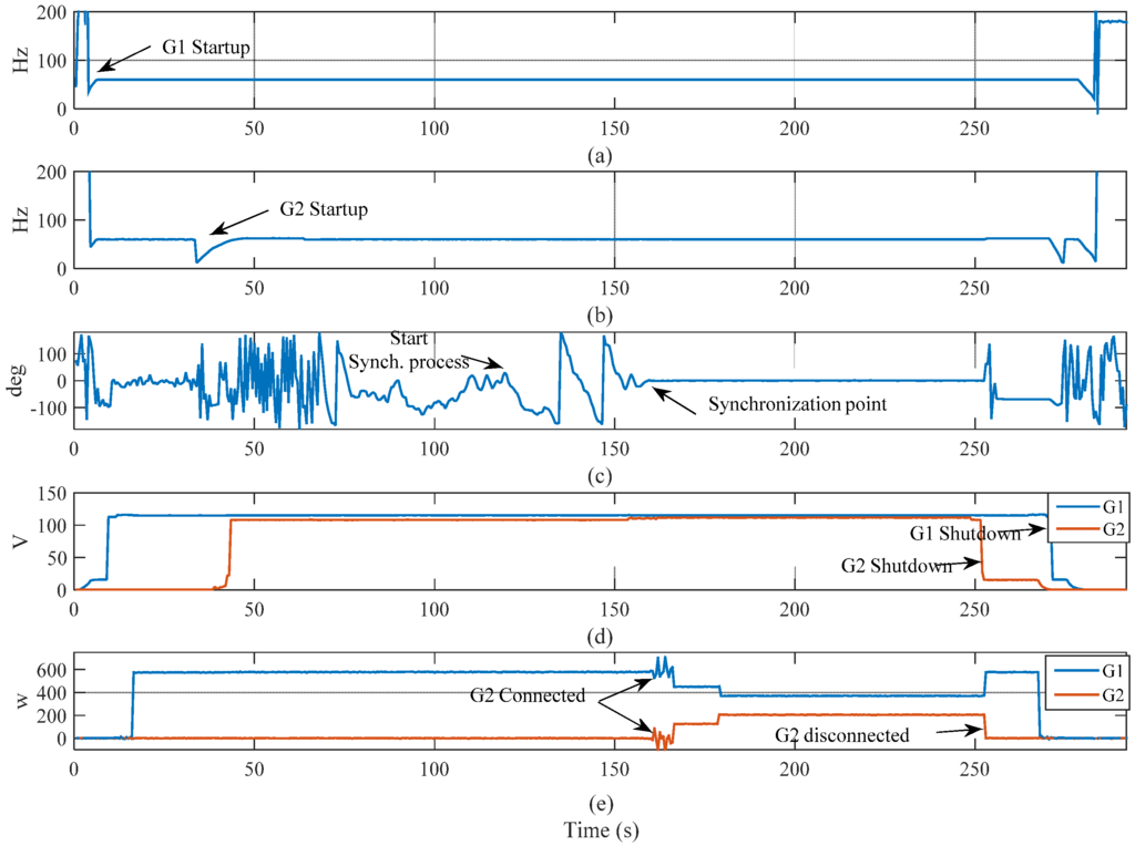 The results of the carried out experiments are depicted in Figure 16 and Figure 17. Figure 16a shows the generator 1 frequency at time 4 s when the startup signal is sent to generator 1. The frequency ramps up until a frequency of 60 Hz is reached. The frequency measured before the generator startup is noise because of the lack of a generator output voltage. At time 9 s, generator 1 is connected and the voltage is stabilized around 115 V as shown in Figure 16d. The load is connected at time 16s as shown in Figure 16e. Figure 16b shows the generator 2 startup at time 34 s. It is worth mentioning that the generator 2 frequency was shown as 60 Hz even before the generator startup due to leakage across the solid state switches. This leads to reading a frequency of generator 1 when generator 2 is not connected. Figure 16c shows the phase angle difference between generator 1 and 2 voltages. Frequency fluctuations can be seen before the synchronization, but these fluctuations go to zero as soon as the process completes. Figure 17 shows a zoom in on time frame 130–250 s to further illustrate the synchronization process. It is clear that the framework successfully performs an accurate synchronization and frequency stabilization in real-time. Figure 16e shows that the slack generator fed all the load while, after synchronization, the load is shared between the two generators.