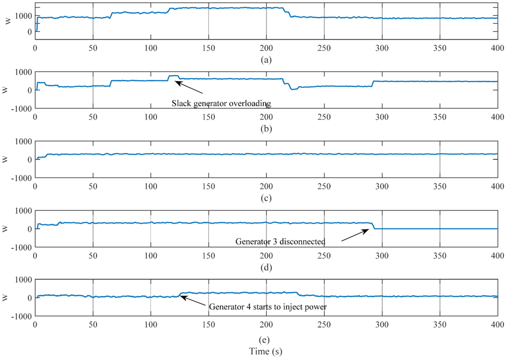 The results of the carried out test are shown in Figure 18 where the total demand (load 1 + load 3) is shown in Figure 18a. The output of the four generators (1–4) is shown in Figure 18b–e, respectively. When the total demand changes from 900 W to 1200 W at time 65 s, the slack generator output changes from 300 W to 600 W while the rest of the load is supplied by generators 2 and 3. At time 115 s, the load increased to 1500 W and consequently, the slack generator output is increased to 900 W which exceeds the preset maximum limit. The controller commands generator 4 to inject power to reduce the slack generator power below the limit. At time 215 s, the load demand decreased to 900 W. In this case, due to low demand, generator 4 returns to reserve mode. An intentional outage of generator 3 is created at time 293 s where the slack generator output is increased to compensate for the lost generation power. However, the slack generator output is still below the critical limit, hence the controller did not initiate a power injection from generator 4. For this scenario, it can be seen that the developed framework was able to efficiently exchange data from multiple sources and controllers in real-time to maintain a power balance between load and generation.
