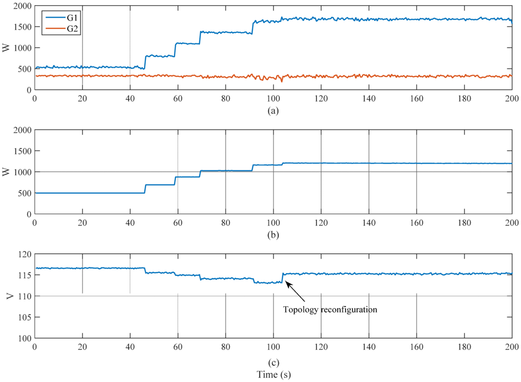 After starting and synchronizing generators 1 and 2, the transmission network is configured to feed loads 3 and 4 as described above. A variable load pattern is applied by controlling load 4 while monitoring the load voltage. When the load reaches 1700 W at time 92 s, the load voltage drops to 113 V. Violating the allowed voltage limit triggers a topology reconfiguration from radial to ring by connecting transmission line TL 1-6 at time 104 s. This reconfiguration improves the load voltage profile from 113 V to 115 V as shown in Figure 19c.