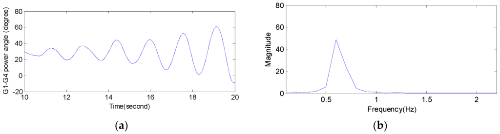 The resonance property of the LFO signal. (a) Power angle oscillation waveform of G4 relative to G1; (b) FFT frequency spectrum.