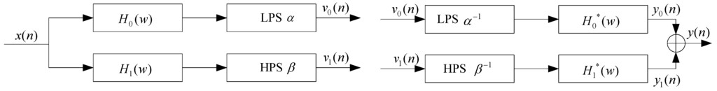 In Figure 3, the sub-band signal v0(n) has a sampling rate of αfs where fs is the sampling rate of the input signal x(n). Likewise, the sub-band signal v1(n) has a sampling rate of βfs. LPS and HPS represent low-pass scaling and high-pass scaling, respectively.