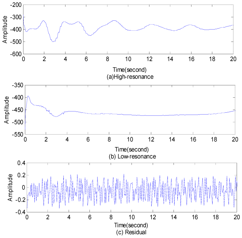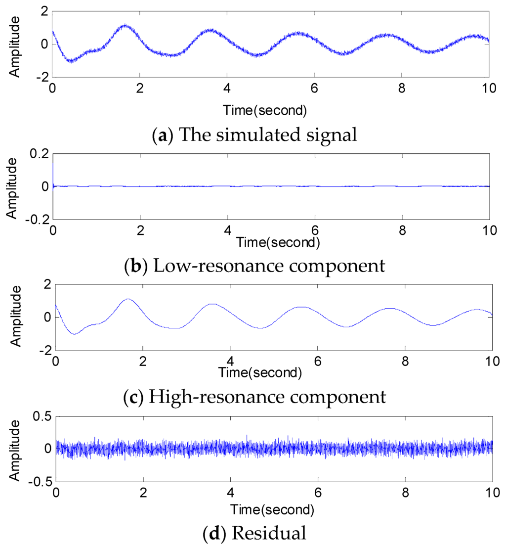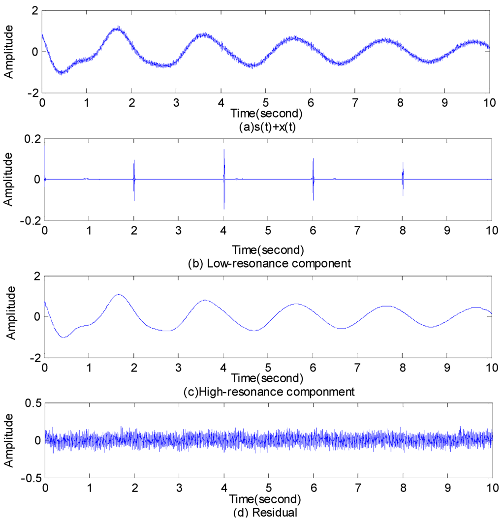 It can be seen from Figure 5 that this procedure separates the given signal into three signals that have quite different behavior. One signal (high-resonance component) is sparsely represented by a high Q-factor wavelet transform (Q = 4). The second signal (low-resonance component) is sparsely represented by a low Q-factor wavelet transform (Q = 1). The third signal (residual) is the signal component which is not sparsely represented in either the high Q-factor wavelet transformation or the low Q-factor wavelet transformation.