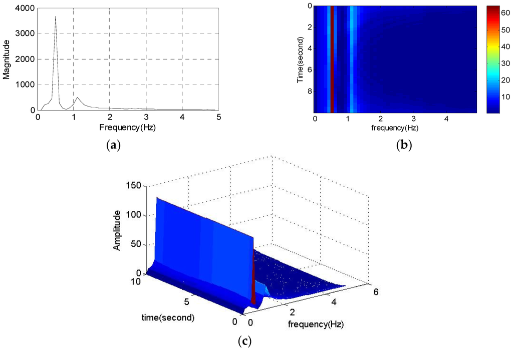 Full band time-frequency distribution analysis by FSWT. (a) Fourier spectrum; (b) The 2D maps of FSWT coefficients; (c) The 3D maps of FSWT coefficients.