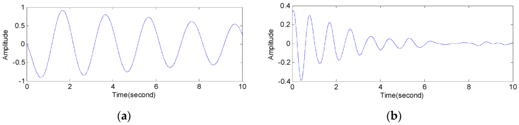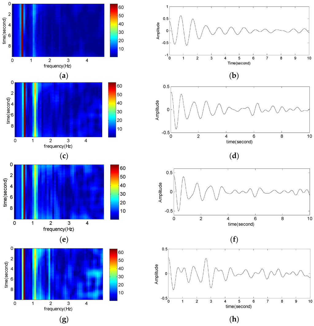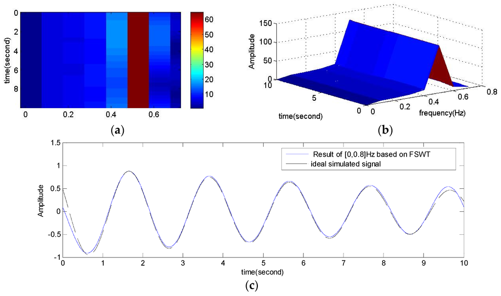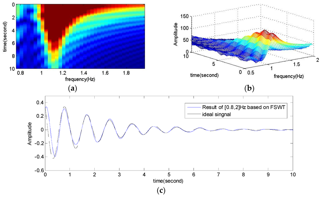 Accurate analysis of the time-frequency features is shown in Figure 8 and Figure 9. According to the analysis results of Figure 7, the chosen frequency slices are [0, 0.8] Hz and [0.8, 2] Hz, respectively. Note that each modal signal on the 2D map of FSWT coefficients is a connected area. This is an important feature for modal signal separation. Here the segments are not strict, but it is necessary that each slice include the main energy of one modal signal. We can reconstruct the objective signal through Equation (14). The reconstructed signals shown in Figure 8c and Figure 9c are good. There are only some differences in FSWT amplitudes. The end is not accurate reconstruction, because the reconstructed signal and the ideal signal do not perfectly match in the end, but this does not affect damping estimation, because the damping is only a ratio of the FSWT amplitudes.