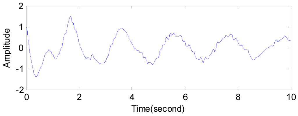 After the simulated signal with white Gaussian noise of Equation (15) is processed through a low-pass filter, we obtain a signal with colored Gaussian noise, which can be seen in Figure 12. Choose frequency slices are [0, 0.8] Hz and [0.8, 2] Hz, respectively. The reconstructed signals are shown in Figure 13.