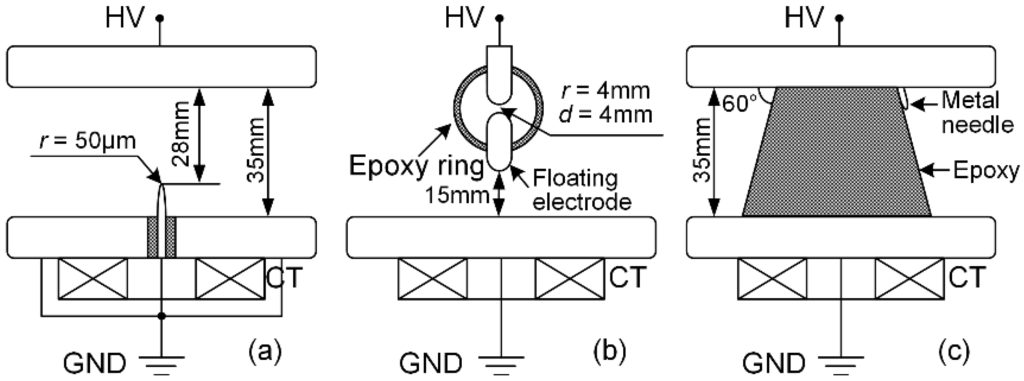 Configurations of partial discharge (PD) defect models. (a) Metal needle in uniform background field; (b) Floating-potential metal electrode; (c) Metal particle with 10 μm radius fixed on insulator surface in contact with upper electrode. All the metal electrodes were made of copper (TU2) except for the stainless steel (Crl8Ni9Ti) needle electrode.