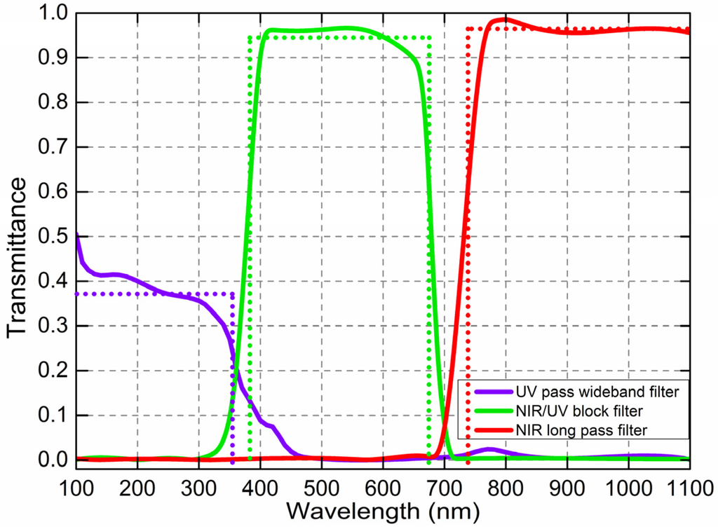 Transmittances of light filters used in the measurement setup. The solid lines are the experimental results and the dotted curves are calculated equivalent responses of the three spectral detections.