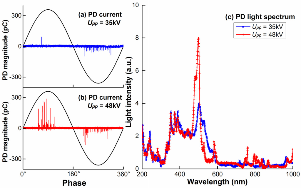 Partial discharge (PD) currents and integral spectra corresponding to PDs triggered by the fixed protrusion under different applied voltage levels. (a) PD current under applied voltage of 35kV; (b) PD current under applied voltage of 48kV; (c) PD light spectra under different applied voltages.