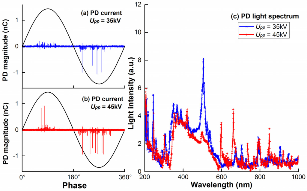 Partial discharge (PD) currents and integral spectra corresponding to PDs triggered by the floating particle under different applied voltage levels. (a) PD current under applied voltage of 35kV; (b) PD current under applied voltage of 45kV; (c) PD light spectra under different applied voltages.