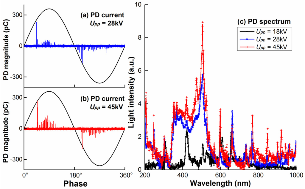 Partial discharge (PD) currents and integral spectra corresponding to PD triggered by a particle on the insulator surface under different applied voltage levels. (a) PD current under applied voltage of 28kV; (b) PD current under applied voltage of 45 kV; (c) PD light spectra under different applied voltages.