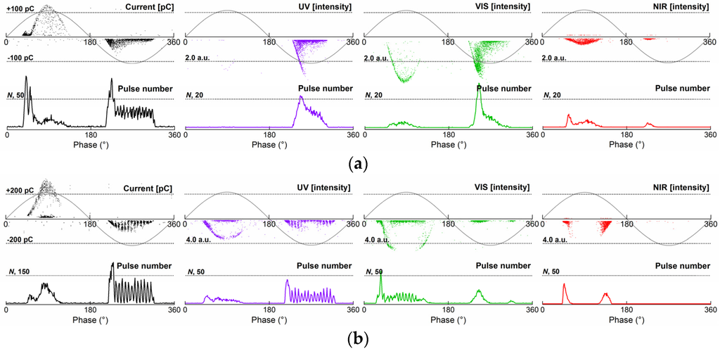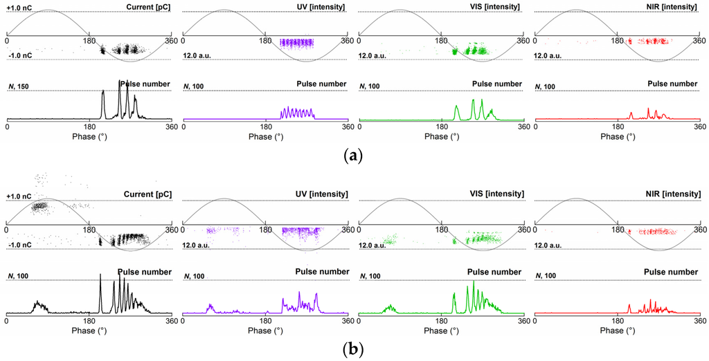 Phase-resolved partial discharge (PRPD) patterns (Φ–q, Φ–N) of partial discharge (PD) current pulses and light pulses in UV, VIS, and NIR ranges for PDs triggered by a particle on the insulator surface in contact with electrode. (a) PRPD results at applied voltage of 25 kV (1.2 PDIV); (b) PRPD results at applied voltage of 35 kV (1.5 PDIV). The gas pressure was 0.2 MPa, and the measurement duration was 2 min for each case.