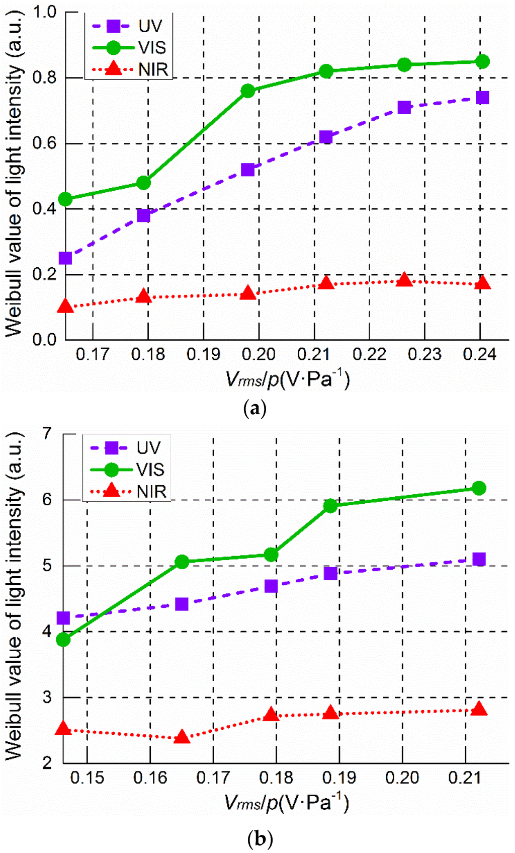 Our Weibull probability analysis indicated that the light intensities increased with increasing applied voltage. The observed drastic increases in the VIS intensity were due to the initiation of PDs in the positive half-cycles with increasing Vrms/p, resulting in the generation of new spectral components in the VIS spectrum, thus yielding an increase in intensity. For the NIR emission induced at the SF6/electrode interface, the intensity changed slightly with increase in Vrms/p because the NIR emission component was small, and it remained unchanged over the entire range of Vrms/p investigated. For PDs occurring along the insulator surface, the NIR spectrum exhibited an obvious increasing tendency with increase in Vrms/p.