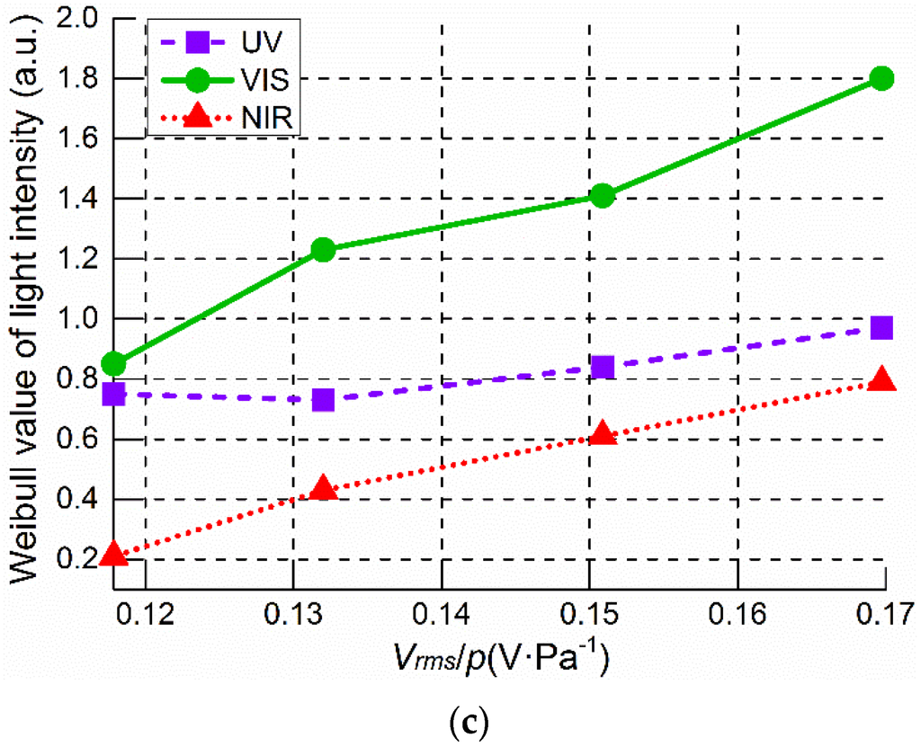Figure 10 shows the Weibull light intensities of the three spectral ranges as a function of the gas-pressure-normalized applied voltage. In the case of the protrusion, the light intensities generally increase with increasing Vrms/p, particularly for the UV and VIS ranges. For the VIS light intensity, there is a dramatic increase in the Vrms/p region from 0.179 to 0.198, as can be observed in Figure 10a. This dramatic increase corresponds to the instant when the PDs begin to form in the positive half-cycles with increasing voltage. The large-magnitude positive PDs contribute to newer components in the VIS spectrum, thereby leading to increase in intensity. This result can also be proved via the spectrum analysis provided in Section 3.1. This kind of increase in the VIS light intensity can also be observed in the case of PDs induced by the particle on the insulator (Figure 10c). For the NIR case, the light intensity changes slightly with increase in Vrms/p because there is very little emission in the NIR range, and it remains unchanged over the entire range of Vrms/p investigated. With regard to the case of the floating metal particle, two dramatic surges in the intensity are observed in the Vrms/p ranges of 0.146–0.165 and 0.179–0.185, as shown in Figure 10b. The first one is caused by the inception of the positive-point-induced spark discharges in the negative half-cycles, and the second is due to the inception of the negative-point-induced spark discharges in the positive half-cycles. In comparison with the VIS light intensity, the intensities of the UV and NIR emissions increase slowly with increasing Vrms/p. In general, the light emission from the PDs in the floating particle case in all the three spectral ranges was considerably more intense than those of the protrusion case. For PDs occurring along the insulator surface, both the VIS and NIR intensities exhibited an obvious increasing tendency with increase in Vrms/p. These results are attributed to new spectrum components in the VIS and NIR ranges arising due to the presence of the insulator surface with increasing discharge energy.