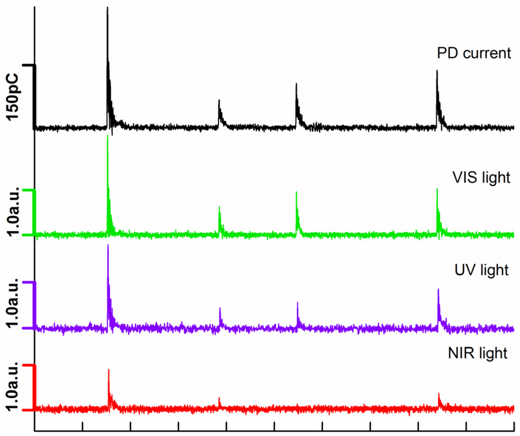 Partial discharge (PD) current and VIS, UV, and NIR light-pulse intensities induced by the protrusion defect in 0.15-MPa SF6 gas at an applied voltage of 1.3 PDIV. PD current was measured by means of a current transformer, and light pulses were measured by means of a photomultiplier tube.