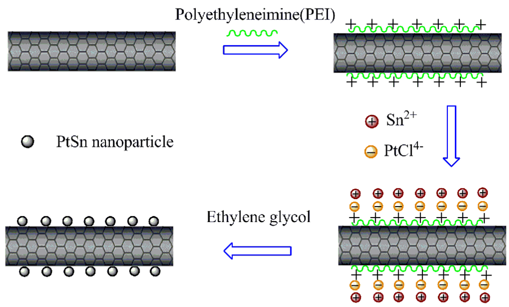 Schematic illustration showing the synthesis of PtSn electrocatalyst supported on polyethyleneimine-functionalized multi-walled carbon nanotubes (PEI-MWCNTs).