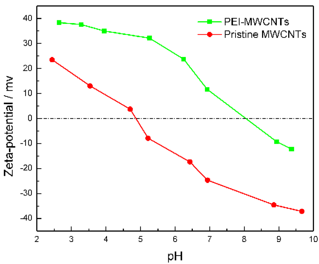 Zeta potential as a function of pH for pristine MWCNTs and PEI-MWCNTs.