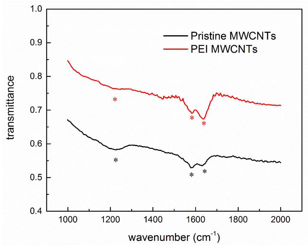 The FTIR spectra of pristine MWCNTs and PEI-MWCNTs are shown in Figure 3. There are three anticipated weak peaks at 1225 cm−1, 1578 cm−1 and 1630 cm−1 (marked by black asterisks) on the FTIR spectrum of pristine MWCNTs confirming the graphite structure of pristine MWCNTs [40]. The relatively sharp adsorption peak at 1637 cm−1 (marked by red asterisks) on the FTIR spectrum of PEI-MWCNTs can be assigned to the bending vibration of N–H [37,40,41] and supports the conclusion of successful functionalization of MWCNTs with PEI. The FTIR and Zeta potential measurement results together verify the successful noncovalent modification of MWCNTs with PEI.
