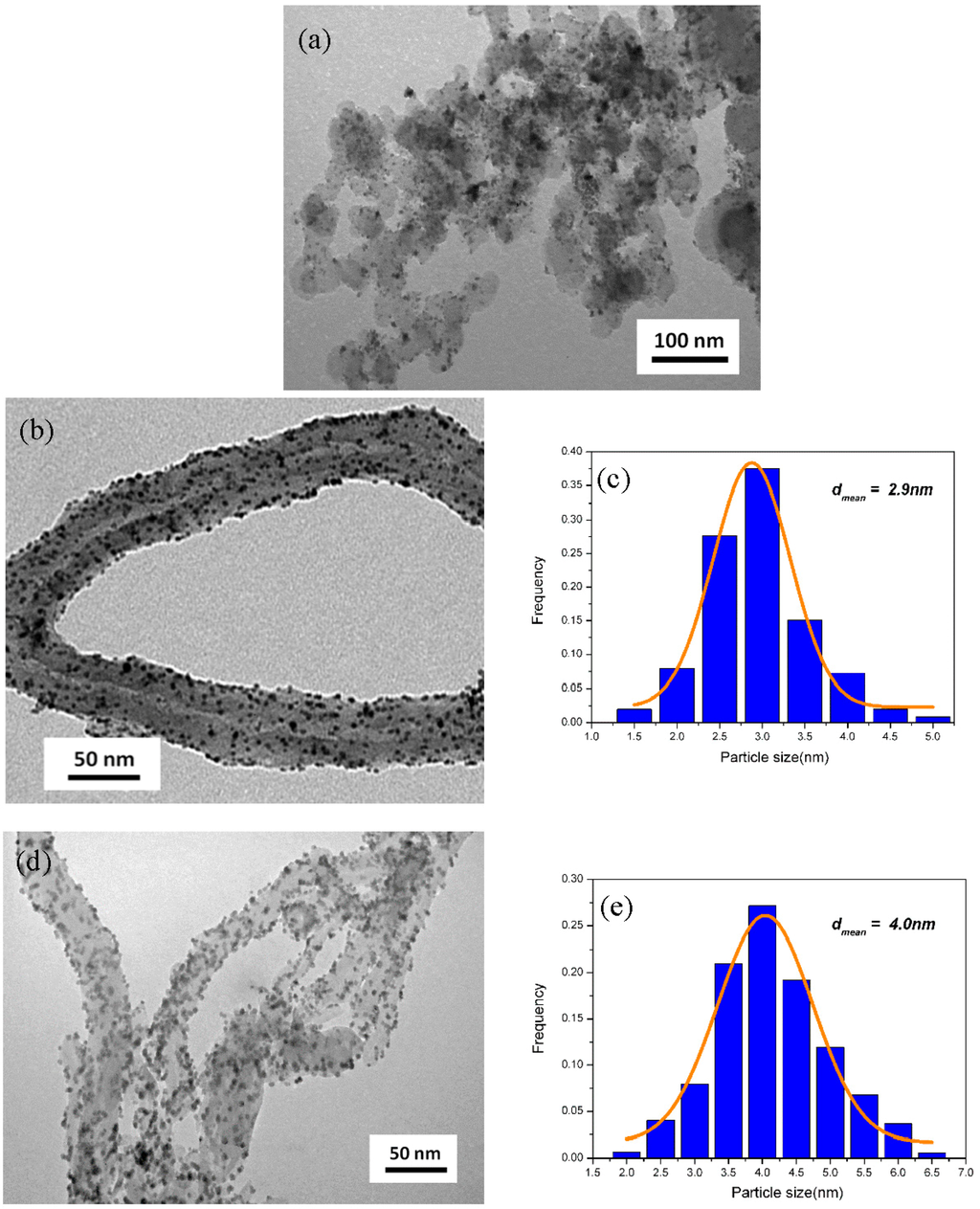 Transmission electron microscope (TEM) images and the corresponding particle size distribution of (a) Pt/XC-72; (b,c) Pt/PEI-MWCNTs; and (d,e) PtSn/PEI-MWCNTs.