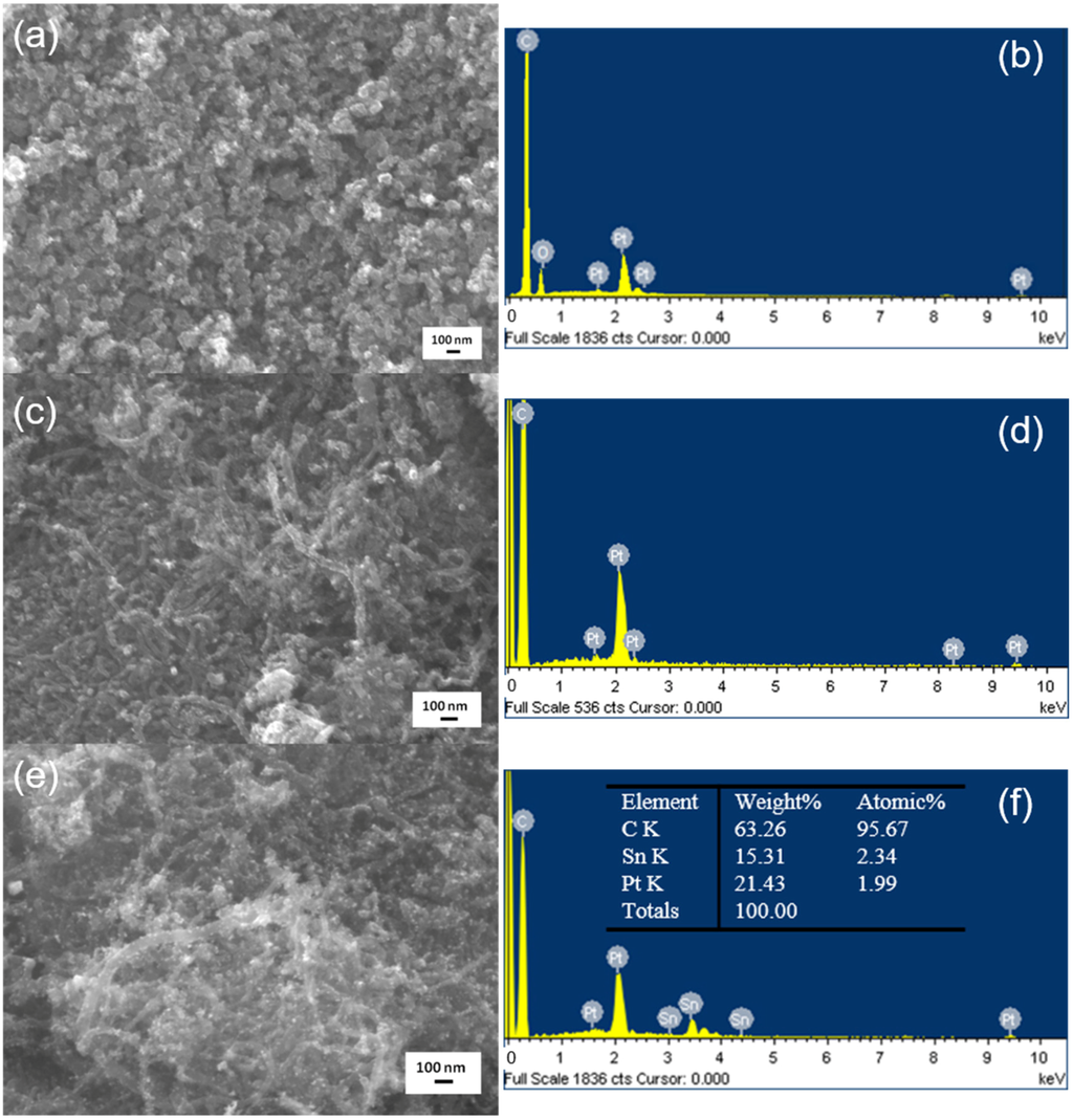 Scanning electron microscope (SEM) images and energy dispersive X-ray (EDX) spectra of (a,b) Pt/XC-72; (c,d) Pt/PEI-MWCNTs; and (e,f) PtSn/PEI-MWCNTs.