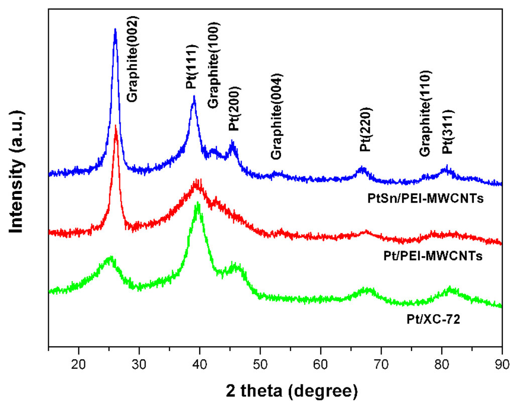 The X-ray diffractograms of various catalysts are shown in Figure 6. The diffraction peaks at 26.3°, 43.0°, 54.3°, 79.8° correspond to the (002), (100), (004), and (110) crystalline planes of the graphite structures of MWCNTs (PDF card 65-6212). The peaks on all three XRD patterns at 40°, 47°, 68°, 81° can be indexed to the (111), (200), (220), and (311) crystalline planes of Pt’s face center cubic (fcc) structure [44]. It is noted that the Pt diffraction peaks for PtSn/PEI-MWCNTs are slightly shifted to lower 2θ angle values with respect to pure Pt (PDF card 4-802). This shift in peak indicates the formation of PtSn alloy, which is caused by the incorporation of Sn in fcc Pt phase [45,46]. The average size of Pt and PtSn NPs can be calculated using Scherrer equation: